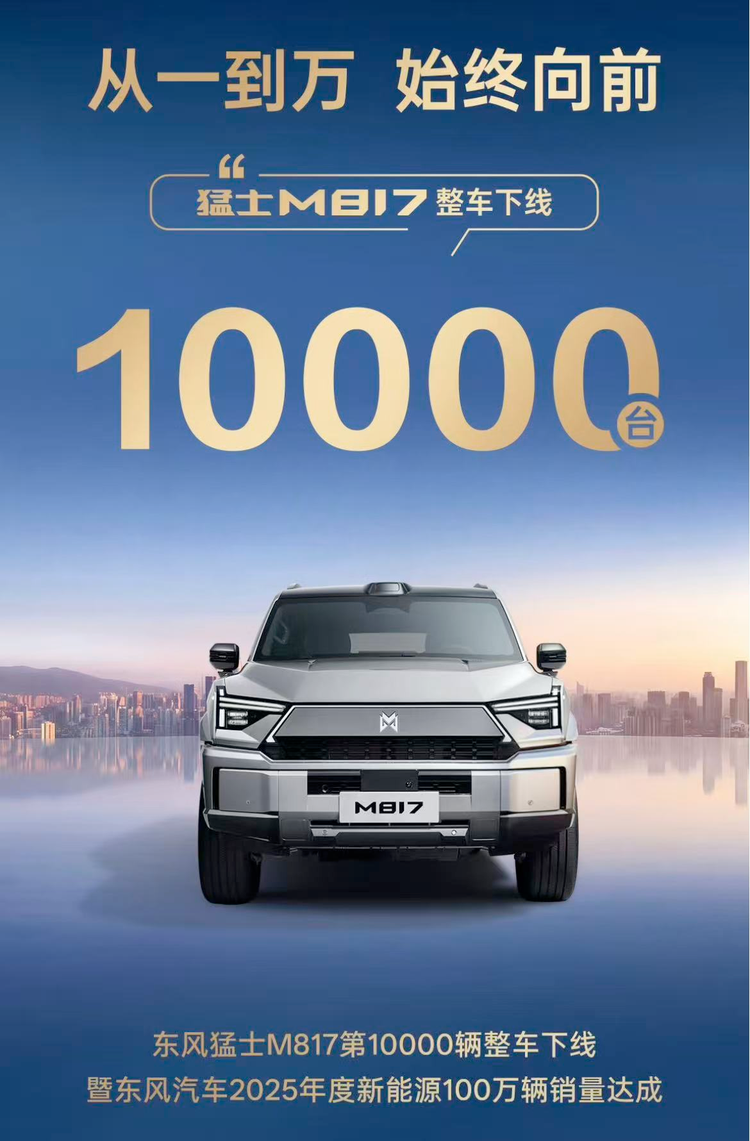 12月26日,东风汽车旗下豪华新能源越野品牌猛士宣布,其主力车型M817第10000辆整车正式下线。这一里程碑事件,恰与东风汽车达成2025年度新能源车100万辆的销量目标相呼应。