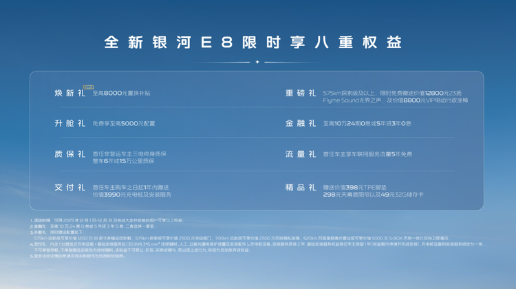最后,不容忽视的是2025年12月限时提供的八重购车权益。这其中包括至高8000元置换补贴、免费升舱礼、多种灵活金融方案、三电系统终身质保、赠送充电桩及安装服务,以及针对575km探索版及以上车型,限时免费赠送的价值12800元的23扬声器Flyme Sound无界之声音响和价值8800元的VIP电动行政座椅。这些权益,实质上进一步降低了用户的拥有门槛与后续成本,放大了产品的价值感。