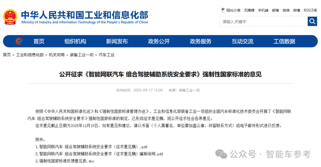 比如今年9月,工信部就《智能网联汽车组合驾驶辅助系统安全要求》强制性国标公开征求意见,为智驾安全划下了清晰红线,并将于2027年正式实施。
