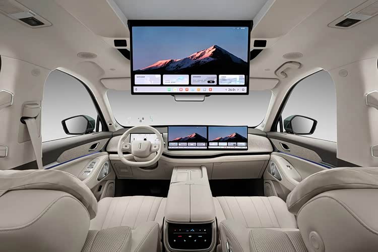座舱科技感也直接拉满,15.6英寸2.5K中控屏+15.6英寸2.5K副驾娱乐屏组成双联屏,配合12.3英寸全液晶仪表和29英寸HUD抬头显示,形成四屏联动,导航、娱乐信息无缝流转。后排17.3英寸吸顶屏更是“哄娃神器”,长途出行再也不用怕孩子哭闹。