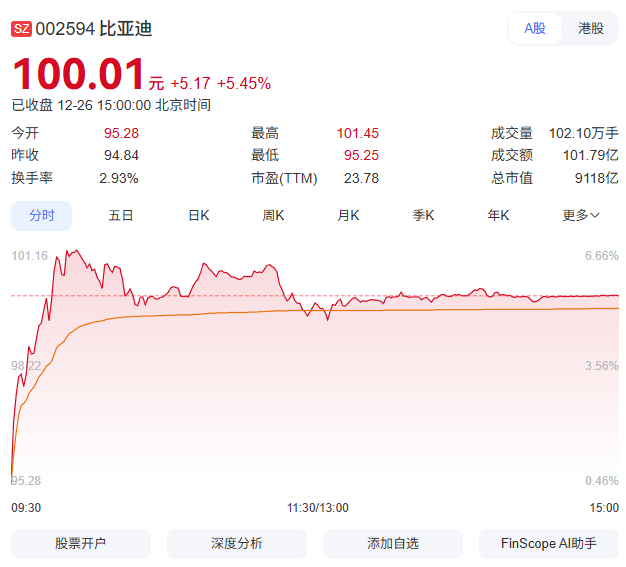 目前,比亚迪最高价为101.45元/股,今开价为95.28元/股,截至收盘股价报100.01元/股,最终收涨5.45%。