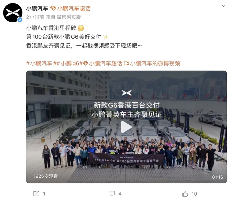 12月26日,小鹏汽车在香港完成了第100台新款G6的交付,这算是一个值得留意的节点。从今年11月首批车型到港算起,只用了8周时间就实现百台交付,在香港的汽车销售环境中,这个速度不算慢。对于小鹏汽车来说,这可能意味着其产品在香港市场初步得到了些认可,但背后的因素还需要更多时间来观察。