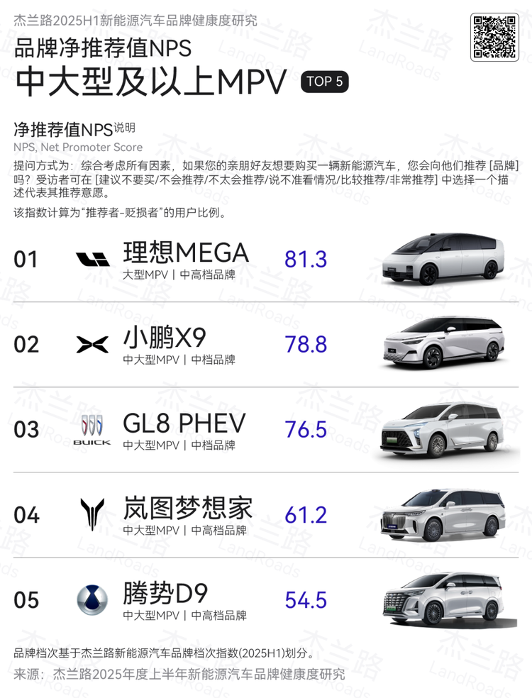 杰兰路发布的《杰兰路 2025 年度上半年新能源汽车品牌健康度研究(NPS 篇)》中,理想 MEGA 以 81.3 的净推荐值,位居中大型及以上 MPV 榜首。