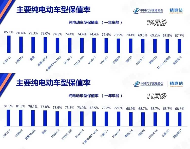 问界 M9 纯电版的保值率从 10 月份的 80.4% 上升至 81.3%,与排名第一的小米 SU7 仅相差 0.2 个百分点, 理想MEGA(参数|询价) 则从 78.0% 上升至 79.1%。