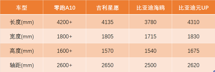 然后是空间,这种级别的车虽然尺寸比较小,但并不意味着就要在空间上妥协,零跑A10通过空间优化,做到了88.1%的得房率。该车的尺寸是4200+/1800+/1600+mm,轴距是2600+mm,如果与竞品相比的话,星愿的尺寸是4135/1805/1570mm,轴距是2650mm,海鸥的尺寸是3780/1715/1540mm,轴距是2500mm,元UP的尺寸是4310/1830/1675mm,轴距是2620mm。
