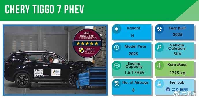 “安全奇瑞”在全球顶级安全评测中再获突破:在东盟新车安全评鉴(ASEAN NCAP)评级中,瑞虎7 PHEV不仅拿下五星安全,更以94.68的综合得分,打破了该机构自2011年成立以来的最高分纪录;iCAR V23(海外名称iCAUR V23)成为获得ASEAN NCAP认证的首款“五星方盒子”车型。