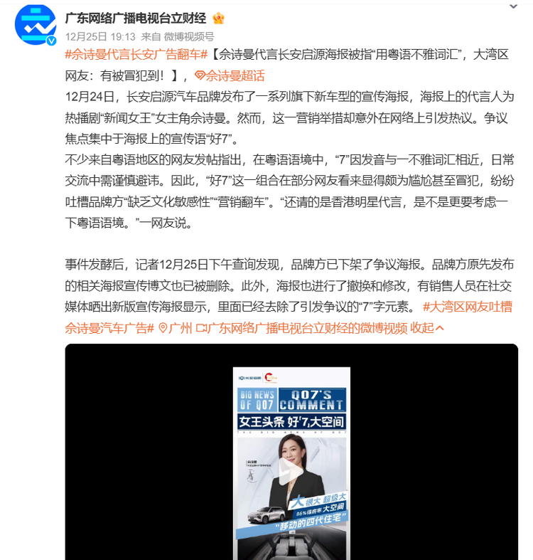 一张新车宣传海报,因为两个字的谐音,将长安启源推上了舆论的风口浪尖。12月24日,长安启源为旗下新车型Q07发布了一组宣传海报,代言人是凭借热播剧《新闻女王》再度走红的香港演员佘诗曼。然而,海报上醒目的宣传语 “好7” 并未带来预期的好评,反而在粤语文化区引发了争议。不少懂粤语的网友指出,“7”的发音在粤语中与某个粗口谐音,“好7” 组合在一起的含义极为不雅。