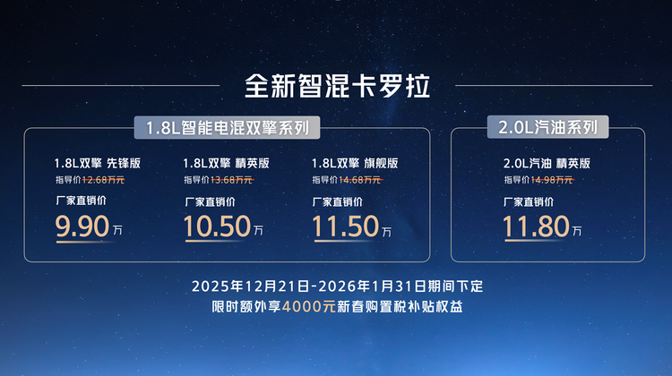 9.9万元的起售价,是全新智混卡罗拉最具冲击力的宣言,但绝非其唯一的竞争力。在混动技术日趋成熟的今天,消费者早已过了“为新技术买单”的阶段,转而追求“成熟技术+合理价格+可靠品质”的三重保障。卡罗拉家族历代车型积累的高保值率口碑(三年保值率超65%),加上丰田全球统一的品控标准,让这款新车从诞生之初就具备了“闭眼买”的底气。即日起至1月31日下定,还可额外享受4000元新春购置税补贴权益,进一步降低购车门槛。