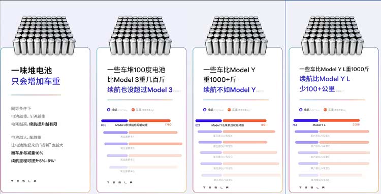 不过从12月份开始,特斯拉的官微似乎有了一些侵略性。之前特斯拉官微发布了一条有关于车重、续航、电池容量的内容中,就用到了“一些车堆100度电池、比Model 3重几百斤,续航也没超过Model 3”、“一些车比Model Y重1000+斤,续航不如Model Y”、“一些车比 Model Y L(参数|询价)重1000斤,续航比Model YL少100+公里”的表述。虽然在图片中,没有提到具体的车型名称,但是可以看到的是,特斯拉这一次措辞很冲,国内市场很多轿车、5座SUV、6座SUV,都在特斯拉的“火力覆盖”之下……