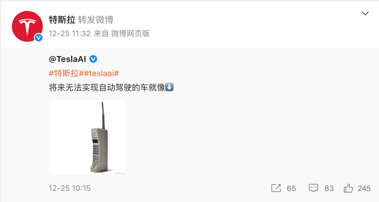 最近特斯拉在国内的官微上,又发布了一条内容,这条内容非常直白,将来无法实现自动驾驶的车就像大哥大,这条内容可以说相当有攻击性。因为大哥大是一个非常“古早”的物件,很多30岁左右的小伙伴,基本上都没有见过大哥大,大哥大是一款除了在特定场景下可以打电话,其他啥都干不了的通讯工具,而且体积庞大,带起来非常不方便,所以当时很多人出门,都只能拿在手里。用大哥大形容未来没有自动驾驶的车,可以说骂得非常脏,因为很多燃油车车企,注定到不了自动驾驶那一天……