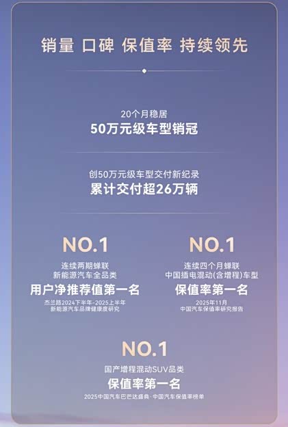 问界M9的成功,不止于销量。在中国汽车流通协会发布的《2025年11月中国汽车保值率研究报告》中,问界M9已连续四个月蝉联中国插电混动(含增程)车型保值率第一,并在2025中国汽车巴芒达盛典“中国汽车保值率榜单”中位列国产增程混动SUV第一,展现50万级豪华车价值新高度。