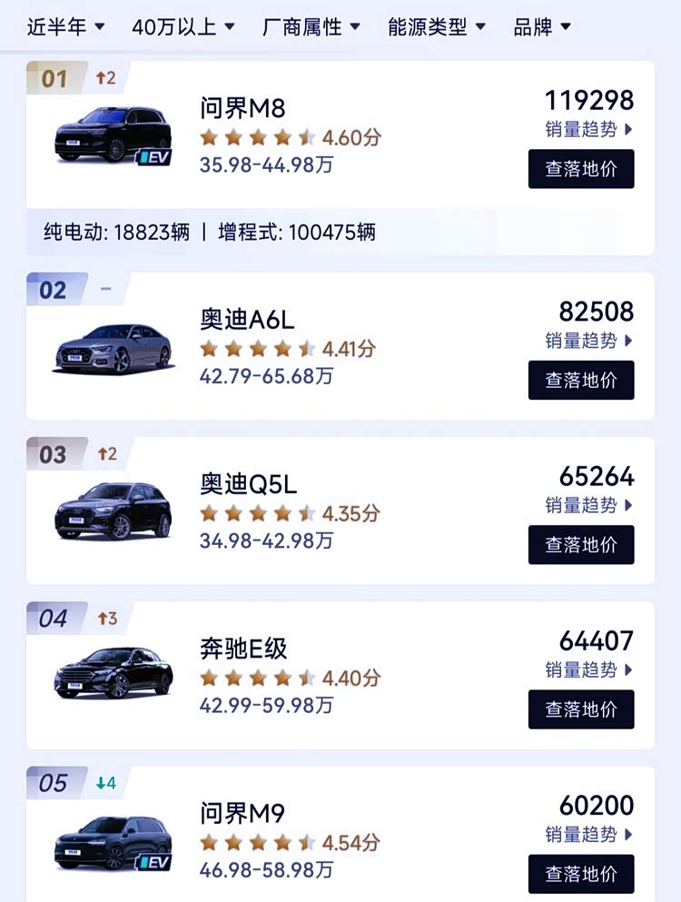 这是最近半年售价40万以上车型的销量排行榜TOP5,万万没想到啊,曾经被bba完全垄断的榜单,如今没有一款车型的销量能在半年内突破10万台,并且还失去了第一名,卖的最好的是奥迪A6L,但只有82508台,奥迪Q5L和奔驰E级,都是6万多台。