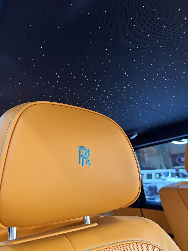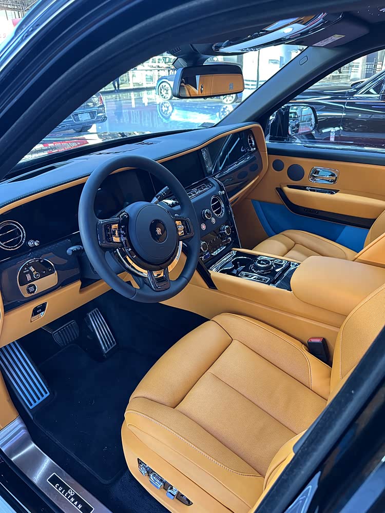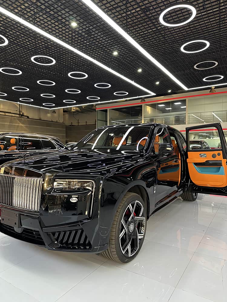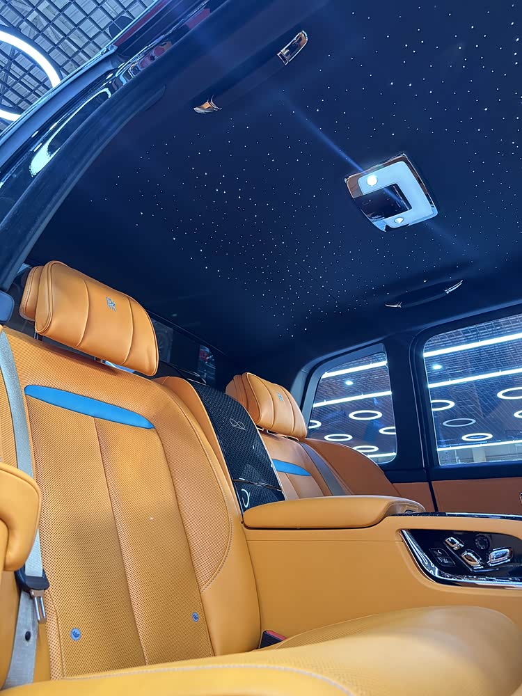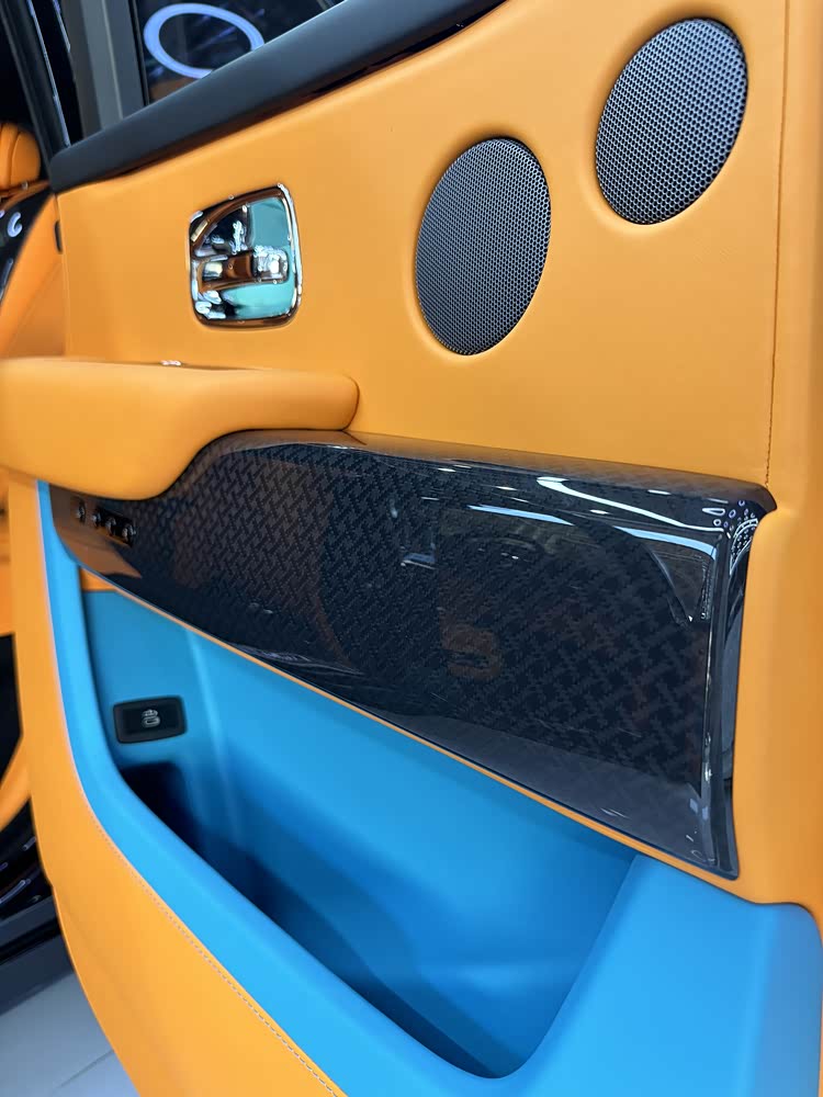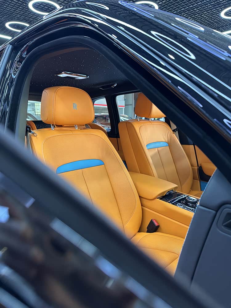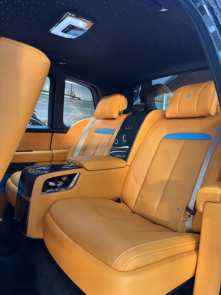 配置:4座,爱马仕橙配/绿松石/黑内饰,全苯胺真皮座椅,前排座椅通风加热,后排座椅加热按摩,金色安全带,流星顶,23BB轮毂,红色卡钳,碳纤维内饰,后排香槟冷柜,RR刺绣头枕,悬浮式轮毂盖