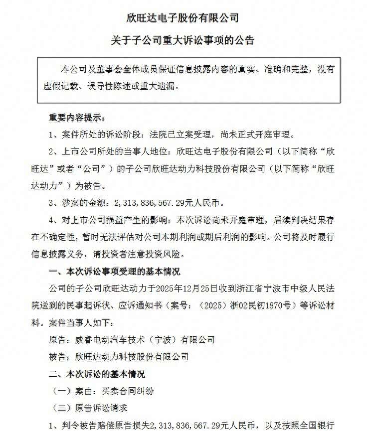 欣旺达电子股份有限公司(以下简称“欣旺达”)披露公告称,子公司欣旺达动力科技股份有限公司(以下简称“欣旺达动力”)于12月25日收到浙江省宁波市中级人民法院送达的诉讼材料。原告方威睿电动汽车技术(宁波)有限公司(以下简称“威睿”)以欣旺达动力于2021年6月至2023年12月期间向原告交付的电芯存在质量问题并给原告造成损失为由提起诉讼,要求欣旺达动力赔偿原告损失人民币23.14亿元,以及自起诉之日起计算至实际支付之日止的利息。