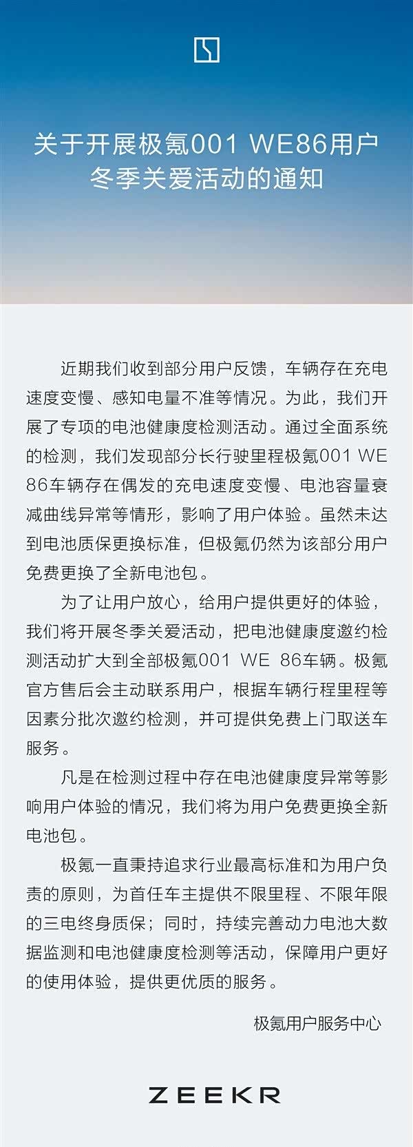 我们把时间线拉回到2024年,当年极氪旗下的畅销车型—— 极氪001(参数|询价),有不少极氪001 WE86车型车主反馈称,部分长行驶里程车辆存在充电变慢、电池容量衰减异常等情况。极氪官方对此的解决方案也非常的给力,为全部极氪001 WE86车型免费更换全新电池包,变相的召回。