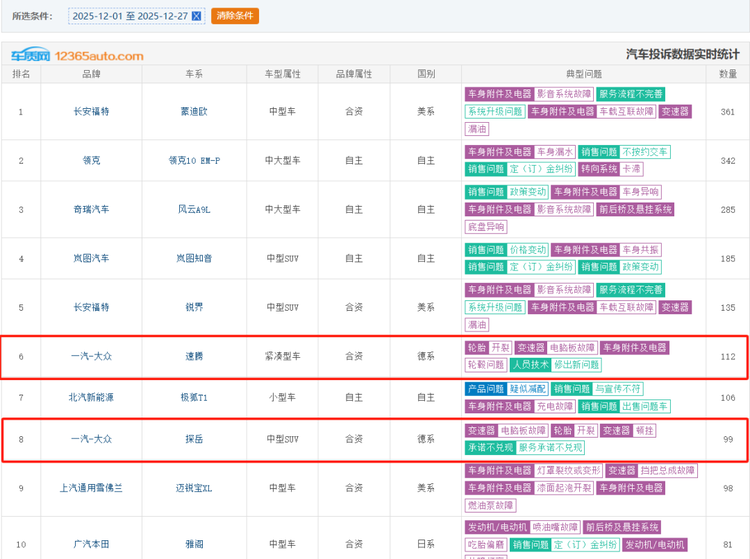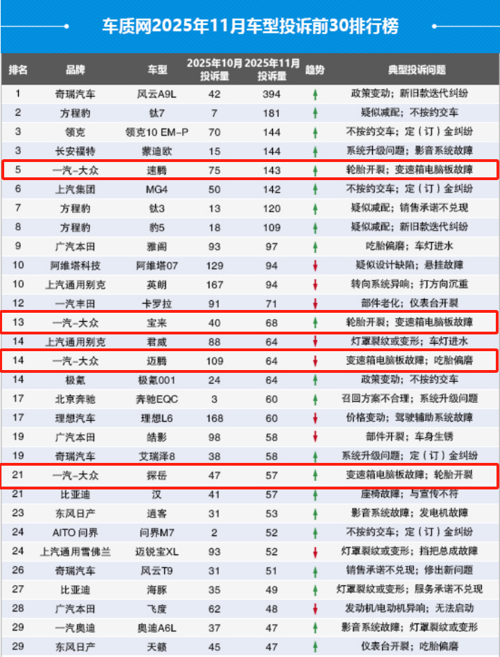 从具体投诉数据来看,问题呈现出明显的集中爆发态势:12月过去的二十余天里,一汽大众速腾、探岳两款车型再度登上投诉榜,核心投诉点直指变速箱电脑板故障,相关投诉量已达百余起。