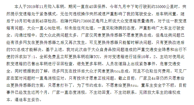 也是希望向一汽大众发出警示:用户的投诉真实存在,切勿敷衍了事,需尽快解决变速箱故障问题,否则将严重损害品牌口碑与声誉。