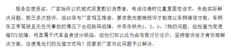 还有用户反映,自己的车辆存在缺失1、3、7挡的严重故障,经检测确定为变速箱TCU故障。从故障表现来看,这明显指向车辆设计缺陷,但车主多次向厂家和4S店投诉,问题始终未能得到解决。