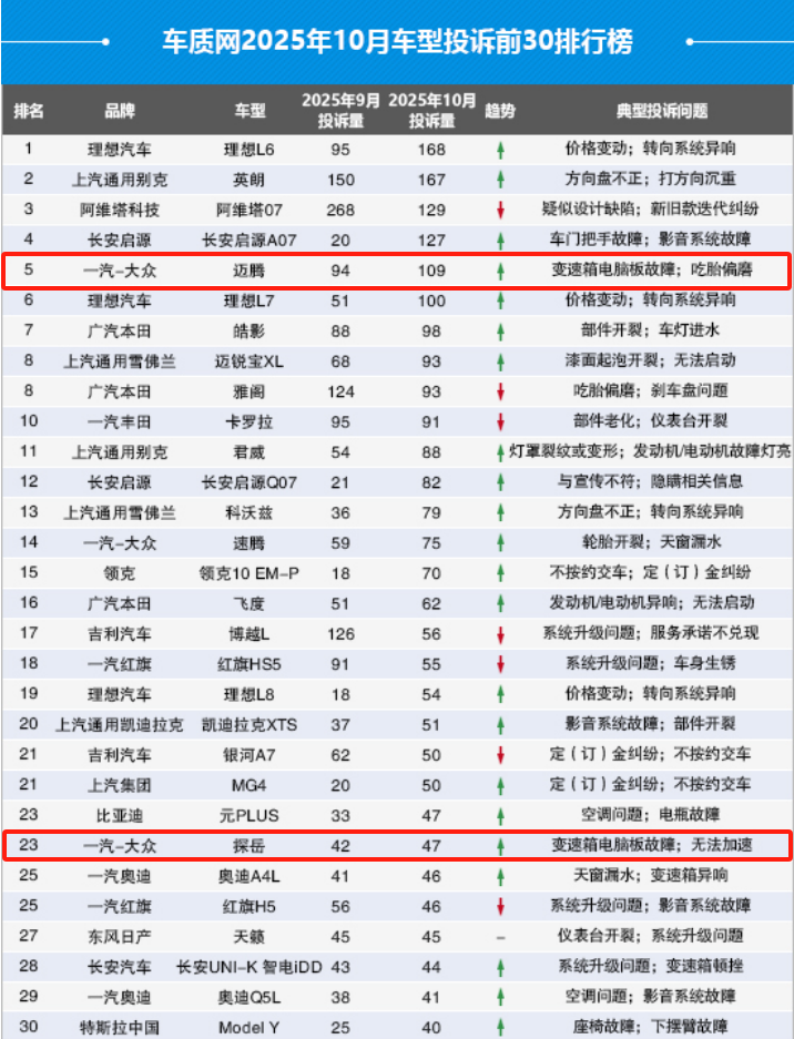时间回溯至11月,投诉榜单上的一汽大众车型更增至四款——速腾、宝来、迈腾、探岳齐齐上榜,而它们的共性问题依然是变速箱电脑板故障;再看10月的车型投诉排行,迈腾、探岳同样因变速箱电脑板故障跻身榜单。