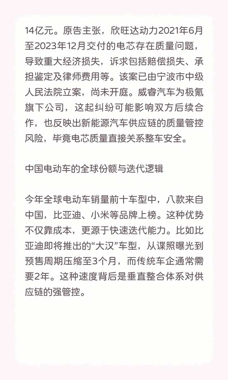 12月26日晚间,欣旺达公告显示,全资子公司欣旺达动力因买卖合同纠纷被威睿电动汽车技术(宁波)有限公司起诉,涉案金额23.14亿元。原告主张,欣旺达动力2021年6月至2023年12月交付的电芯存在质量问题,导致重大经济损失,诉求包括赔偿损失、承担鉴定及律师费用等。该案已由宁波市中级人民法院立案,尚未开庭。威睿汽车为极氪旗下公司,这起纠纷可能影响双方后续合作,也反映出新能源汽车供应链的质量管控风险,毕竟电芯质量直接关系整车安全。