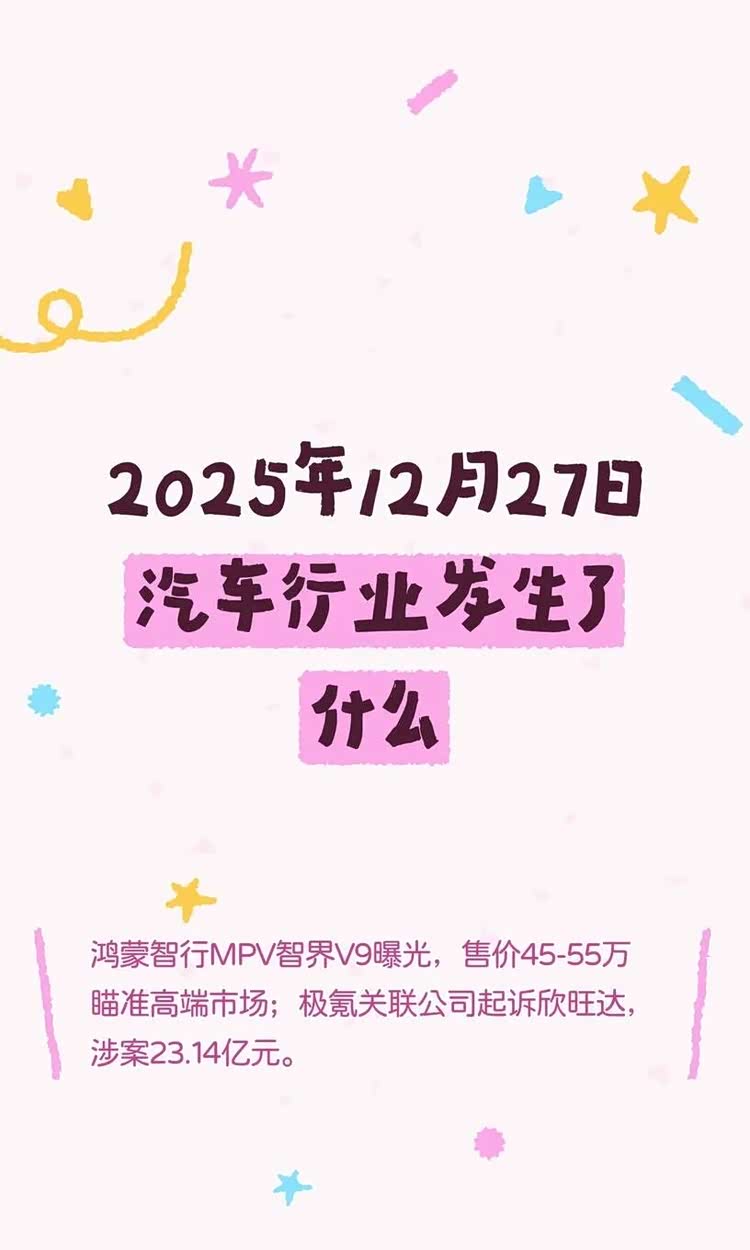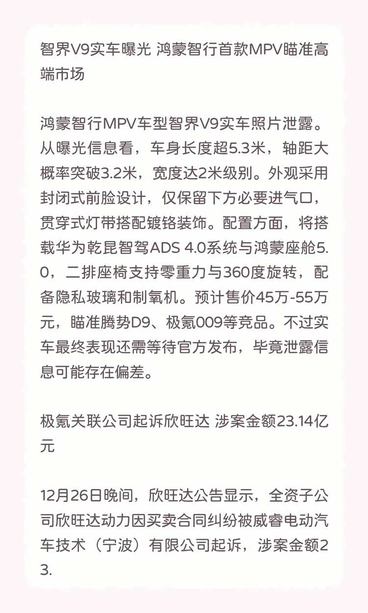 车家号·0浏览·2025-12-27 20:42 · 四川鸿蒙智行MPV 智界V9(参数|询价)曝光,售价45-55万瞄准高端市场;极氪关联公司起诉欣旺达,涉案23.14亿元。