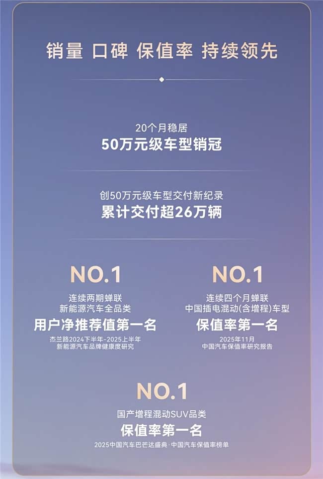 问界辅助驾驶的月活用户占比超95%,印证了用户对这套系统的高度依赖 —— 它能缓解长途驾驶的疲惫,消除陌生路况的焦虑,让用户从 "敢用" 到 "常用" 再到 "离不开"。而这样的产品力,正持续收获市场的双重认可:不仅创下累计交付超 26 万辆的销量奇迹,更拿下净推荐值、保值率双料冠军。连续四个月蝉联中国插电混动(含增程)车型保值率第一,连续两期斩获新能源全车型用户净推荐值榜首,更在用户满意度指数评测、J.D. Power 魅力指数榜单中稳居豪华插电混动 SUV 第一,一系列殊荣让问界 M9 的标杆地位无可撼动。