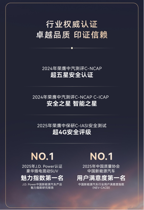 两年来,问界M9不仅赢得了市场,更获得了用户的高度认可。在杰兰路2024下半年-2025上半年新能源汽车品牌健康度研究中,问界M9连续两期获得新能源全车型用户净推荐值第一。此外,在中国质量协会发布的2025年中国新能源汽车行业用户满意度指数评测结果中,问界M9荣获第一名,并在J.D. Power 魅力指数榜单中位列豪华插电混动SUV第一……这一系列殊荣,共同印证了这款现象级产品在新能源豪华车市场的领先实力,展现独特的标杆魅力。