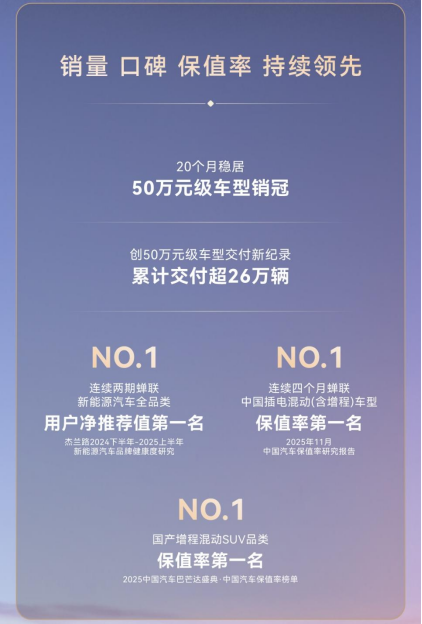 问界M9的成功,不止于销量。在中国汽车流通协会发布的《2025年11月中国汽车保值率研究报告》中,问界M9已连续四个月蝉联中国插电混动(含增程)车型保值率第一,并在2025中国汽车巴芒达盛典“中国汽车保值率榜单”中位列国产增程混动SUV第一,展现50万级豪华车价值新高度。