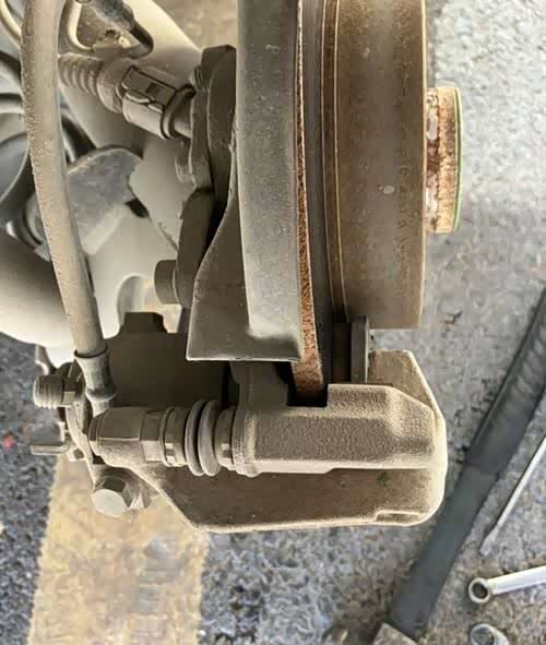 接着,拆下刹车卡钳的螺丝。使用绳子固定制动钳,避免其损坏制动管。然后,取下旧的刹车片。
