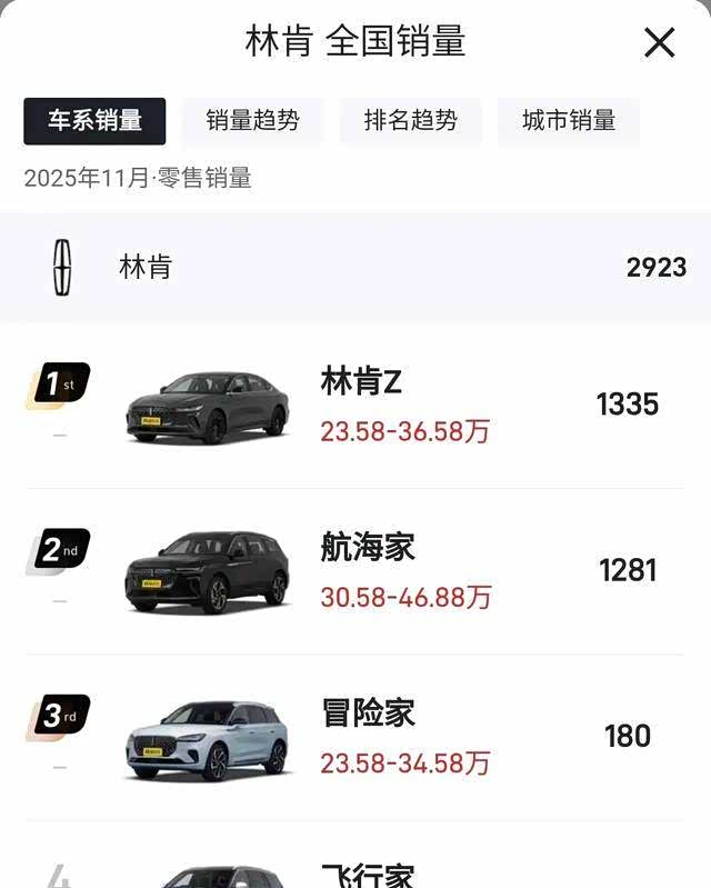 回望过去,林肯也曾有过辉煌的时刻。2021年,其年销量超过9万辆,仿佛一颗冉冉升起的新星。然而,好景不长,次年销量便急转直下,跌至7.93万辆。此后,更是如断崖般下跌,2023年跌破7.16万辆,2024年更是暴跌至5.68万辆。销量数据显示,2025年1-11月林肯累计销量30760辆,同比下滑31.27%,这样的数据,无疑将林肯推向了市场的边缘。