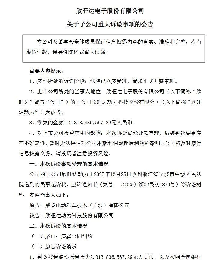 2025年12月26日晚,欣旺达的一纸公告,再次印证了事件的真实性:欣旺达子公司欣旺达动力,被吉利控股集团旗下的威睿电动汽车技术公司告上了法庭。威睿直指其在2021年6月至2023年12月期间欣旺达交付的电芯存在质量问题,因此向其索赔23.14亿元。