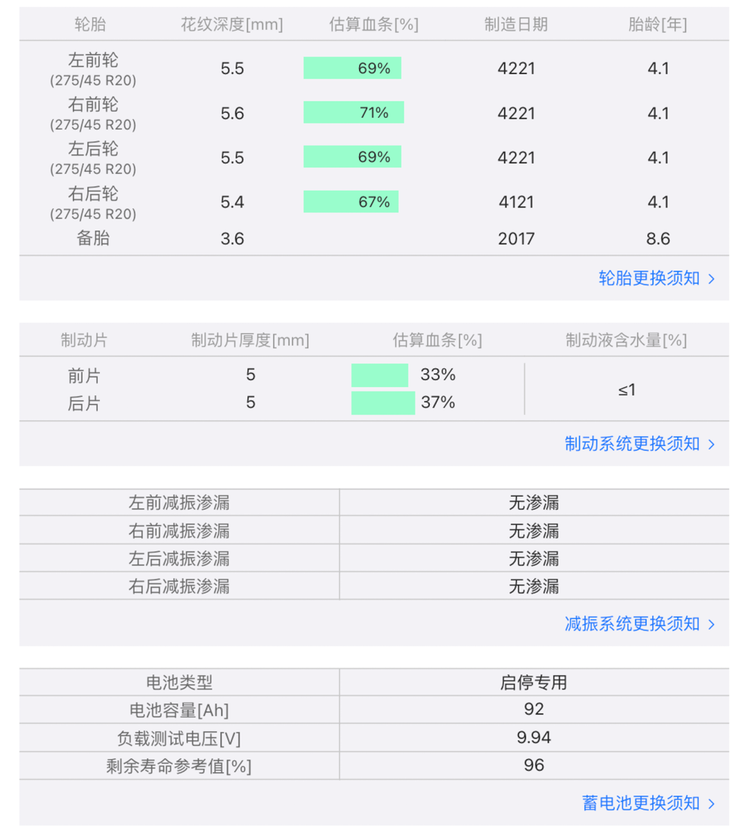 前车主之前在4S做过一些小的维修项目,比如换轮速传感器、换皮带、换蓄电池等等,也做过一些油液的保养,我们这次整备又补充了几个小项目。现在这辆车基本没有给下家留太多的整备提升空间——已经可以到手即用了。