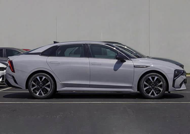 车身侧面,新车整体采用略带溜背风格的三厢造型,C柱位置的溜背线条流畅自然,尾门仍为常规式设计,兼顾运动感与实用性;同时配备隐藏式门把手,有效降低风阻的同时提升科技感,搭配双色多条辐运动轮辋,进一步强化运动属性。一条银色镀铬饰条从A柱延伸至后窗下沿,让车身线条更显连贯精致,车尾预计将配备贯穿式尾灯,与前脸设计形成呼应,搭配优化后的后包围,整体视觉效果协调统一。