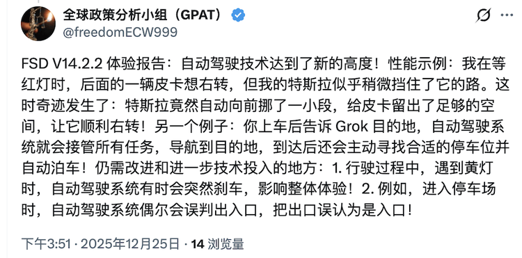 这是继FSD V14.2版本发布后的一次重要小幅度升级,新版本更新包括更流畅的实际性能、更好的障碍物感知以及更精准的终点路线规划等多项改进,也因此收获了一众车主的赞誉。