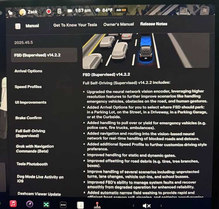 一位体验新版本10小时的海外网友评价这个版本说,该系统“完全没有变道犹豫,车道选择出色,停车也有一些改进,对这个版本的变道表现非常满意。”