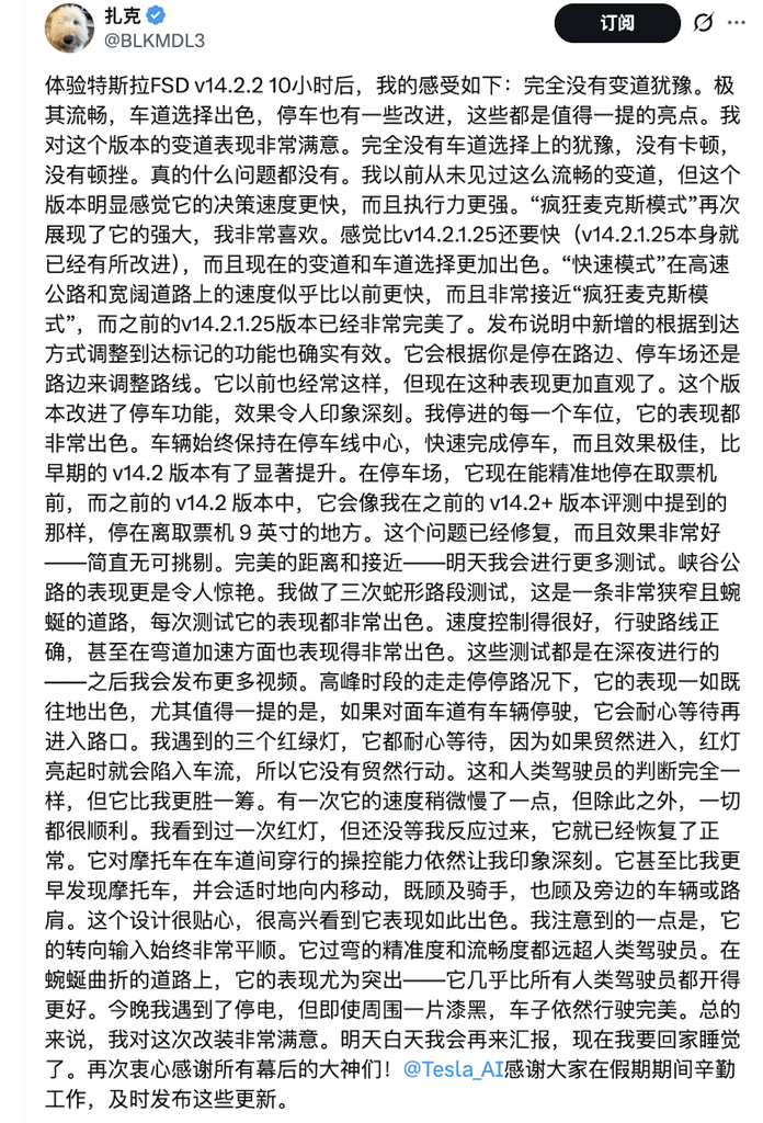 ▲海外网友实测FSD V14.2.2 10小时后反馈