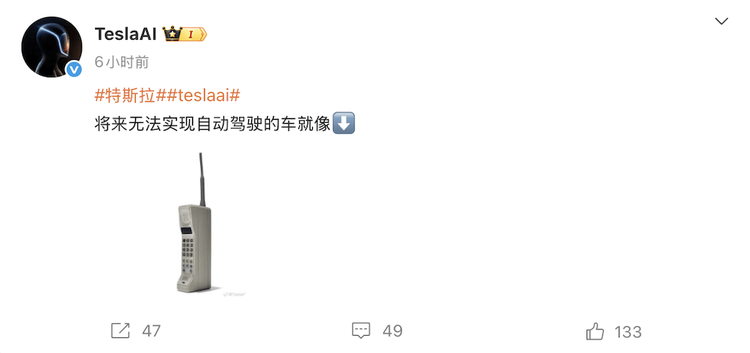 特斯拉官方账号也发帖配图表示,将来无法实现自动驾驶的车就像大哥大。