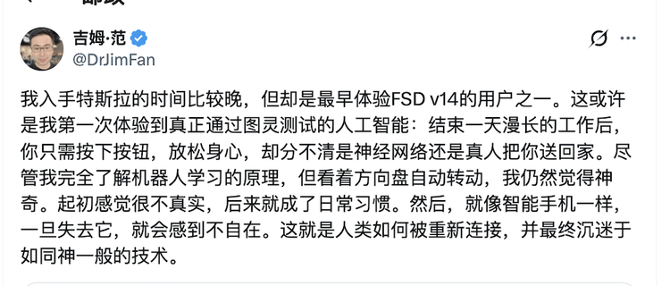 不仅如此,FSD V14.2.2新版本还得到了英伟达机器人业务负责人、杰出科学家Jim Fan的高度认可,他从人工智能的学术与产业高度,为此次更新赋予了更深层次的意义。