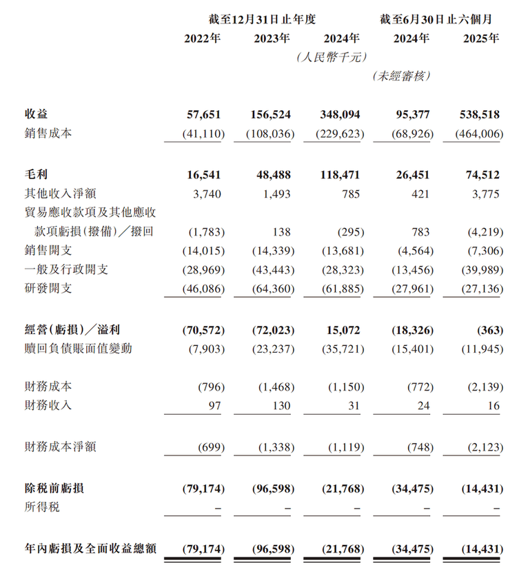 根据其招股书,营收方面,该公司最近三年来营收规模迅速扩大,从2022年的5765.1万元,飙升至2024年的3.48亿元,复合年增长率高达145.7%。2025年上半年,其营收进一步跃升至5.39亿元,同比增幅达464.6%。