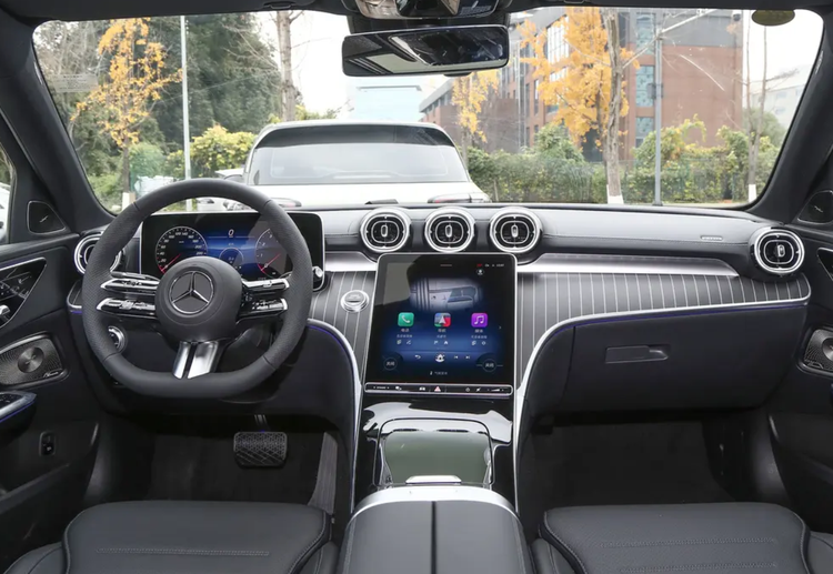 来到内饰,奔驰C级在豪华感的营造上一直处于顶尖,这是毋庸置疑的。那它的液晶仪表也采用悬浮式设计,并且尺寸也来到12.3英寸,而中控屏是11.9英寸,但两块屏幕都有很高的分辨率和清晰度,UI界面和苹果手机一样很细腻。在细节上也有AMG的标签加持,从而提升内饰的运动属性。我最喜欢还是多功能方向盘,手握感很厚实,并且3点和9点的地方都有打孔工艺,因为的真皮包裹所以手感特别柔软。当你开习惯了怀挡,就会觉得很好用,配有感应雨刮,内饰的金属套件的加持也带来了类似迈巴赫的豪华感,但整体布局又比迈巴赫年轻许多。座椅也是运动式一体设计,两侧的夹紧很厚实,包裹性不错。细节上更贴心,比如头枕支持前后调节,可以保障颈椎的支撑,保障每一位乘客的舒适度。车机内置高通骁龙8295芯片,所以唤醒和语音设置都有很高的辨识度,包括反馈速度和执行速度都很同步。