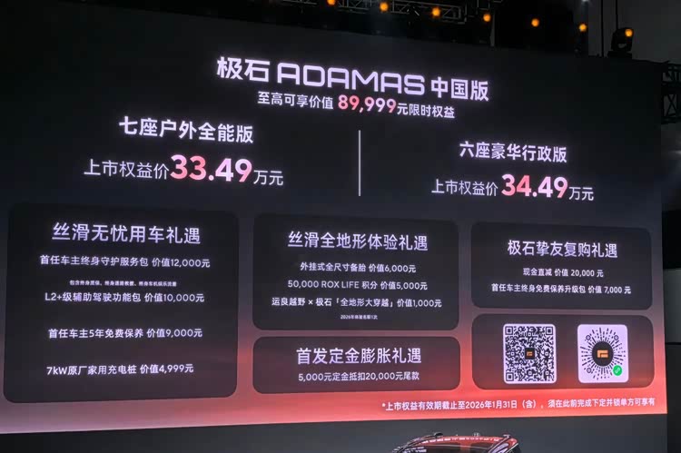 12月28日, 极石ADAMAS(参数|询价)中国版正式上市,新车共推出七座户外全能版与六座豪华行政版两款车型,官方指导价分别为34.99万元和35.99万元,上市权益价低至33.49万元起。作为极石汽车全球化战略的集大成者,ADAMAS以“让豪华,更丝滑”为核心理念,深度融合全地形能力与豪华体验。