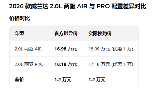 最后再给大家提个醒,选车时先确定自己的动力需求(燃油还是混动)和驱动方式(两驱还是四驱),再根据预算选择配置版本,不要盲目追求高配,毕竟很多豪华配置如果用不上,就是花冤枉钱。如果你看重可靠性、实用性,想要一台省心省力的家用紧凑级SUV,2026款威兰达仍然是一个很值得考虑的选择。
