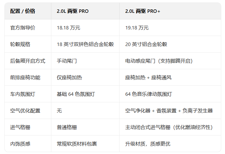 而PRO+版,则面向那些不愿妥协,追求更完善体验的消费者。多花的一万元带来了座椅通风加热、电动尾门等提升品质的配置,让用车生活更惬意。至于顶配的2.5升双擎四驱版本,它集合了强动力、低油耗和更好通过性,适合预算充足、对车辆综合性能有较高要求的用户。