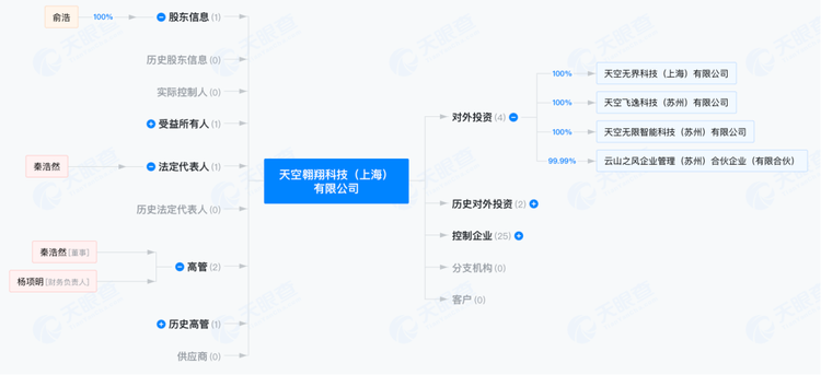 从天眼查再往下追溯,天空无限智能科技(苏州)有限公司则由天空翱翔科技(上海)有限公司100%控股,天空翱翔科技(上海)有限公司由俞浩100%控股。