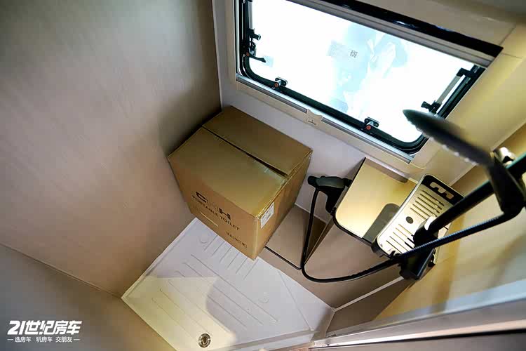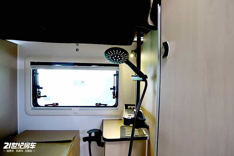 卫浴区域虽精巧却不将就,一体式花洒出水细腻,可放置便携马桶,满足户外洗漱如厕刚需,细节处照顾到旅居的体面与便捷。