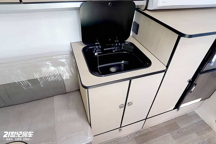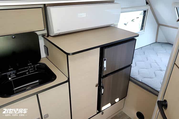 对卡座旁集成实用厨房区,洗菜池搭配五孔插座,可外接各类小家电,85升冰箱能囤够多日食材,上方空调精准控温,四季旅居皆舒适,全车丰富储物柜设计,轻松收纳露营装备与生活杂物,告别杂乱。