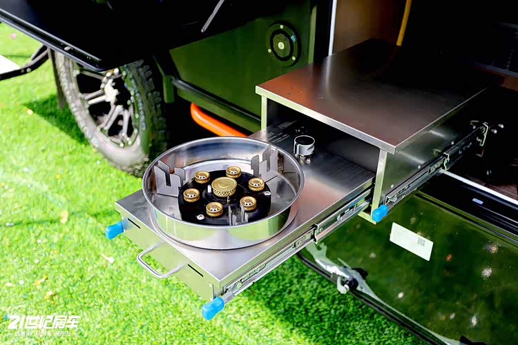 外观设计兼顾实用性与场景感,外置厨房、多功能置物板布局合理,取水口与取电口就近排布,搭配上方遮阳棚,轻松打造独立户外烹饪区,露营时煎炒烹炸不扰车内,还能沉浸式享受自然野趣,细节设计尽显贴心。