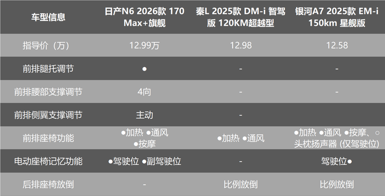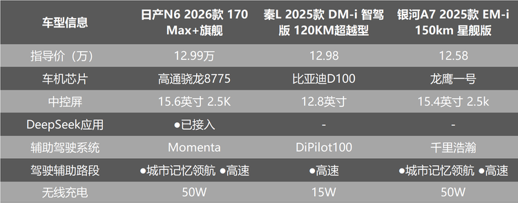 这样一来,秦L DM-i和银河A7的入门款车型都会受到影响,而日产N6得益于全系180km纯电续航里程的配置(顶配170km),不受影响。