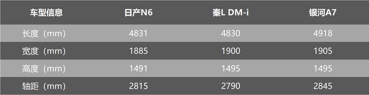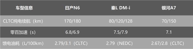 实际上,通过对比也可以看到,日产N6的续航里程表现,不管入门款还是高配车型,整体都是要强于秦L DM-i和银河A7的。