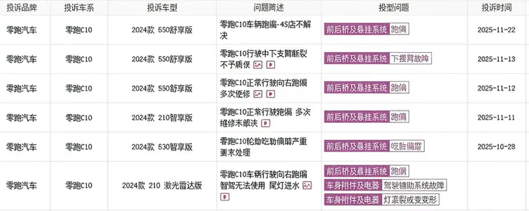 作为销量主力的C10车型,是朱江明主导下的核心产品之一,11月投诉指数突破113,累计销量2.1万辆的同时,问题覆盖售前诱导下单、交付延期超15天、售后轮胎偏磨等,部分车辆行驶4000公里即需换胎。2025年5月,陕西党先生购买零跑C10后,车辆在正常行驶中刹车时频繁“前窜”,于低速跟车或停车时无法平稳制动,反而向前冲撞,致使车内乘客多次因惯性前倾、险撞前车。党先生多次反馈,零跑售后仅归因于“软件兼容性问题”让升级系统,两次OTA升级后问题仍未改善,且未检测硬件,让车主发出“不敢让家人坐第二次”的感言。